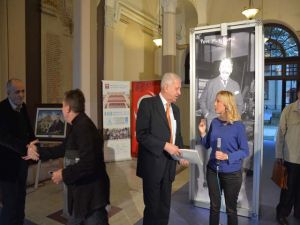 Posle Akademije, u Svečanoj sali Rektorata BU ugledne zvanice su u Holu zdanja Rektorata prisustvovali sjajno organizovanoj Izložbi sa preko 5o eksponata /sa nekoliko stotina fotografija/ na kojima su prikazani život i rad Mihajla I. Pupina. Izložbu je otvorio izaslanik Predsednika Republike Srbije – prof. dr Oliver Antić i prigodnim rečima pohvalio napore organizatora da na najlepši način predstave našeg slavnog naučnika. Veliku pomoć u postavljanju Izložbepružio je Beogradski sajam. Tom prilikom poznati somborski slikar Milan Stojkov uručio je izaslaniku Predsednika svoj umetnički rad u ulju – kompoziciju sa portretom Pupina, kao dar za Zdanje Predsednika Republike. /umetnička slika je već narednog dana izložena u svečanom salonu za prijem gostiju Predsednika Srbije/.