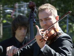Potom je Stefan Milenković izveo na violini takodje omiljenu Teslinu melodiju “Tamo Daleko“, koju mu je povremeno svirao njegov prijatelj, veliki svetski violinista Zlatko Baloković.